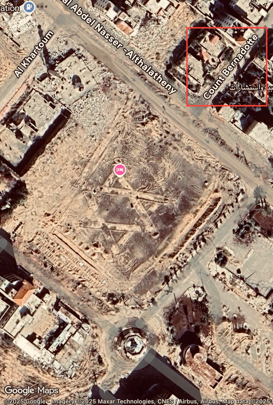 History does not fade because bulldozers command it to. Even in landscapes flattened into scars, traces remain — faint, stubborn, insistent. In the aerial image of Gaza where Israeli tanks carved a Star of David into the earth, meant as a spectacle of domination, another mark intrudes. In the top corner, outlined in red by Google Maps, a road still bears the name: Count Folke Bernadotte.