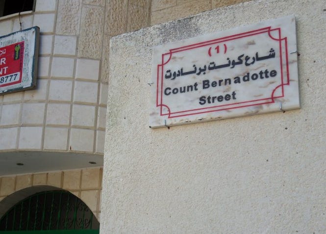 The Swedish diplomat. The UN’s first mediator. The man assassinated in Jerusalem in 1948 after daring to propose that Palestinians had claims, that refugees had the right to return. To see his name surviving there, carved into the dust beside a symbol of erasure, felt like a rebuke from the past — as if a ghost had returned to sign the rubble.